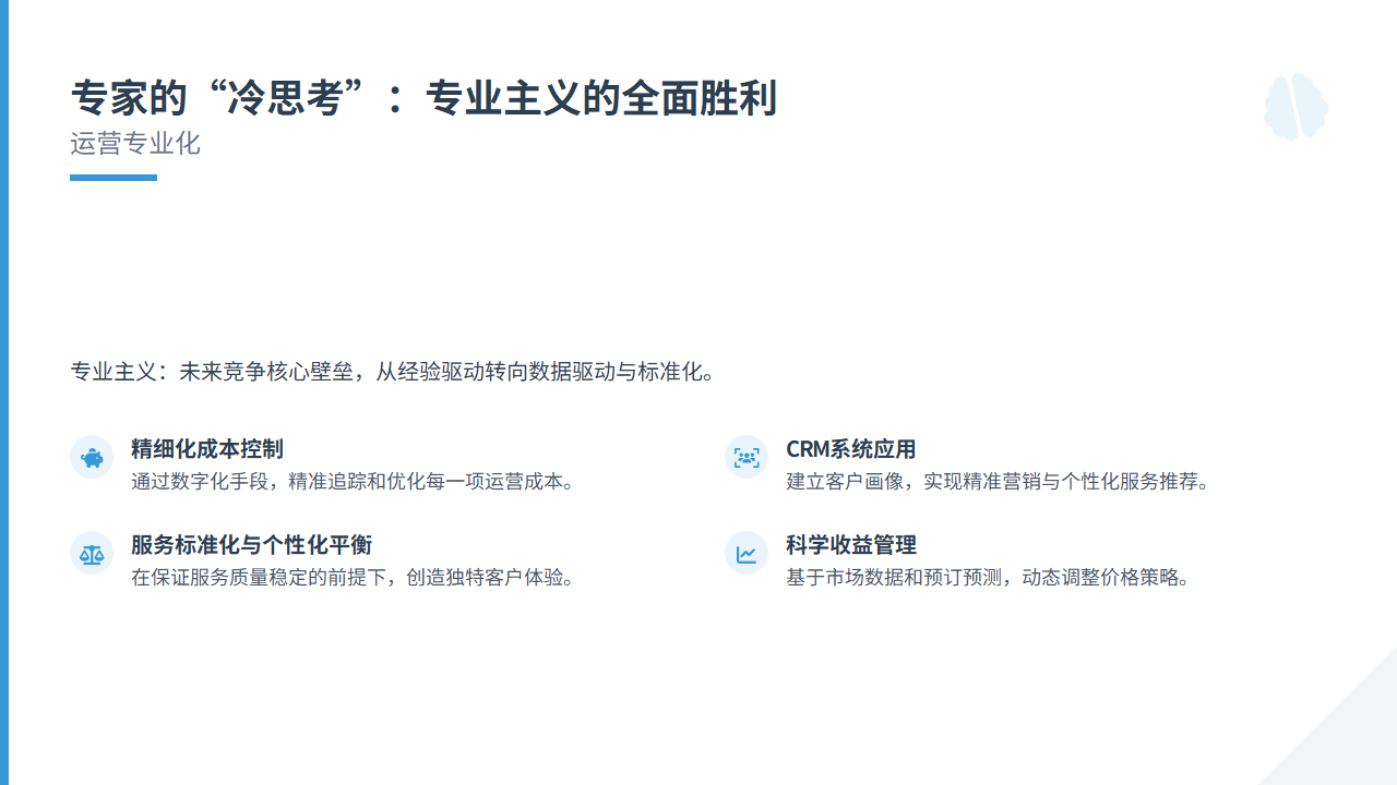 运营的专业化: “拍脑袋”式的定价,凭感觉式的营销,将难以为继。取而代之的,是基于SaaS系统的数据化决策,是精细到每一个触点的用户体验设计,是可量化、可评估的**投入产出比(ROI)**管理。