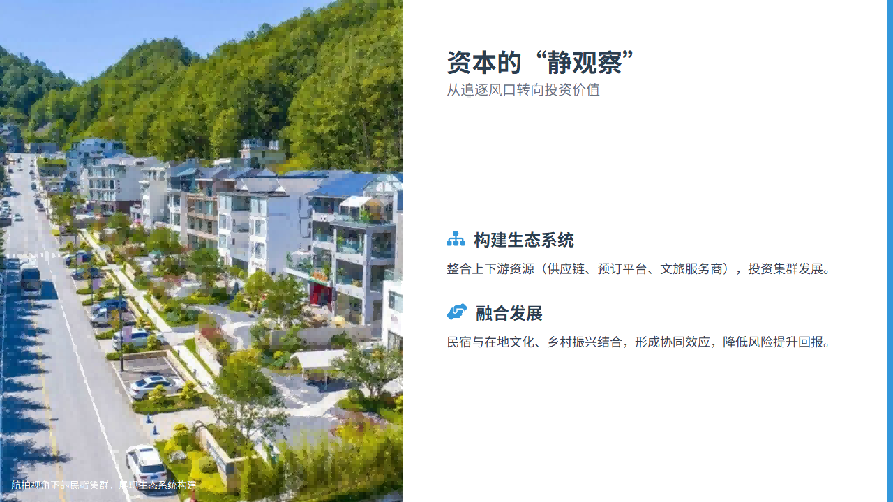 从“单体”到“生态”: 单体民宿,因其不确定性,已很难进入主流资本的视野。但一个定位清晰、管理规范、具备“可复制”潜力的“在地民宿联盟”或“小型品牌矩阵”,则开始展现出巨大的吸引力。资本愿意投资的,是一个能“滚雪球”的“生态系统”。