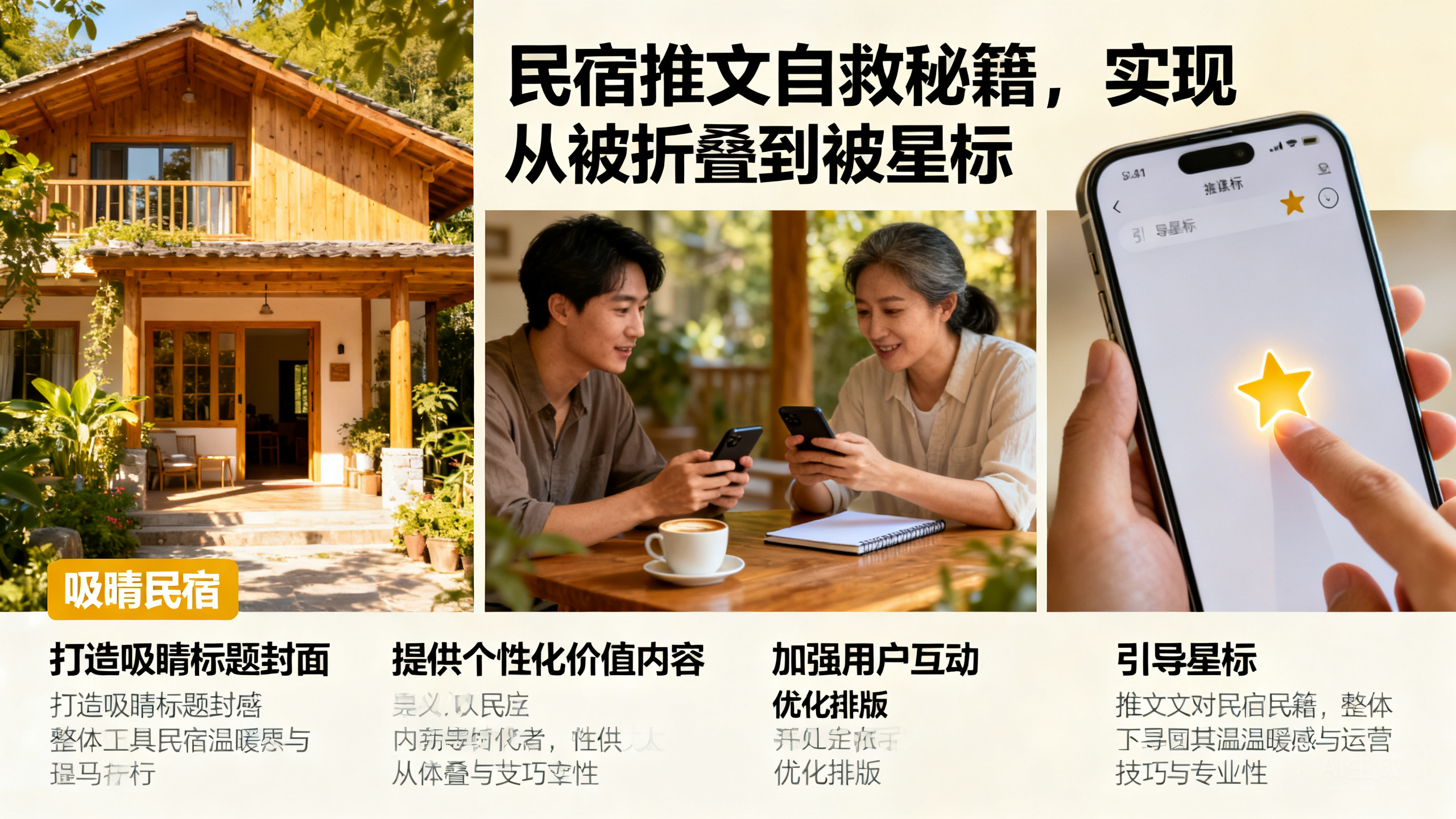 封面图要精美独特,引发好奇:封面图就像是文章的 “门面”,要足够精美独特,才能吸引用户的目光。可以选择民宿最具特色的房间、风景或活动场景作为封面图,确保图片清晰、色彩鲜艳,能够引发用户的好奇心。同时,要注意封面图与标题的搭配,两者要相互呼应,共同传达文章的主题。