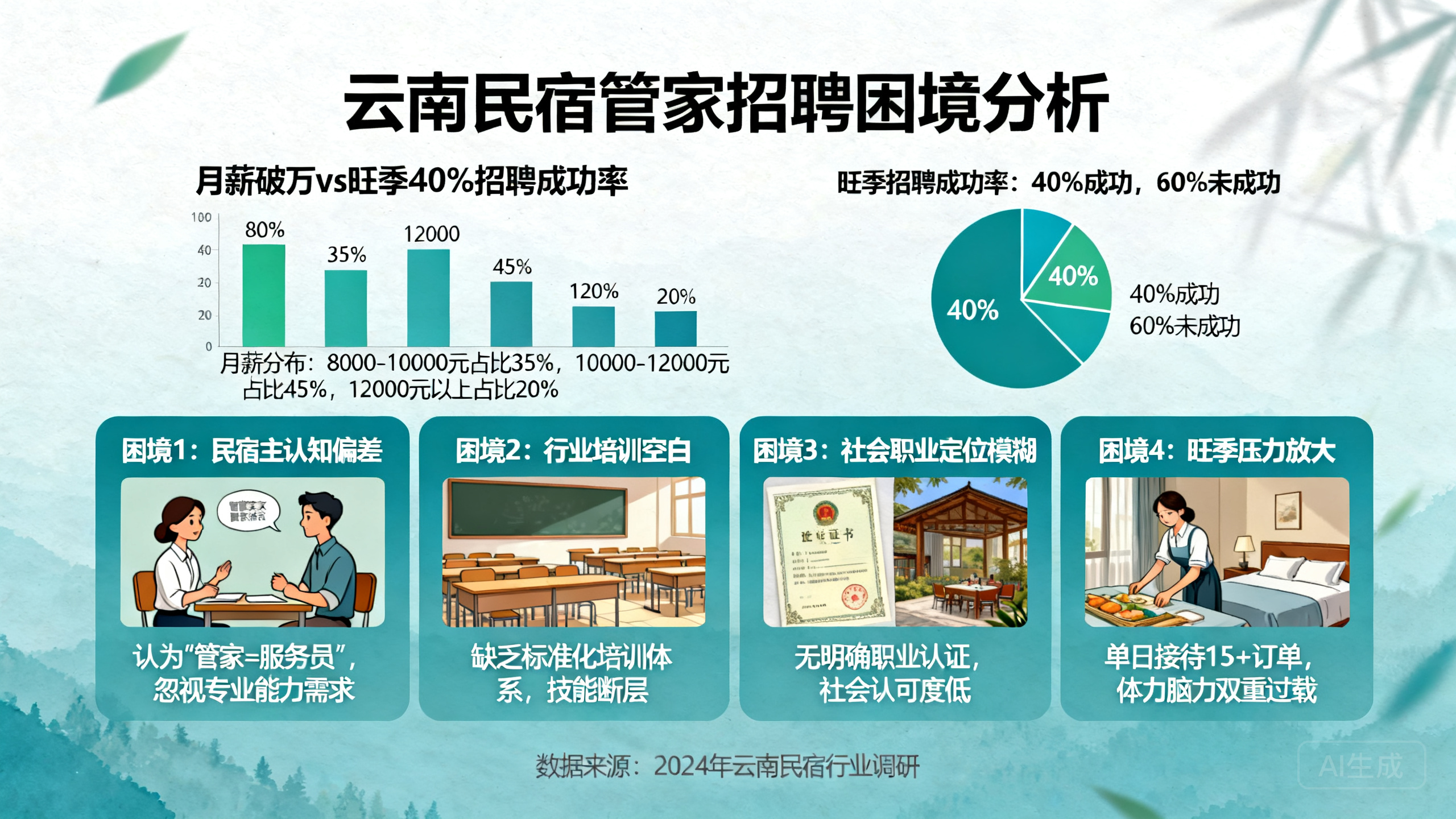 2024年,云南民宿行业快速发展,旺季(如“五一”)入住率达85%,但管家短缺成为瓶颈。协会数据显示: