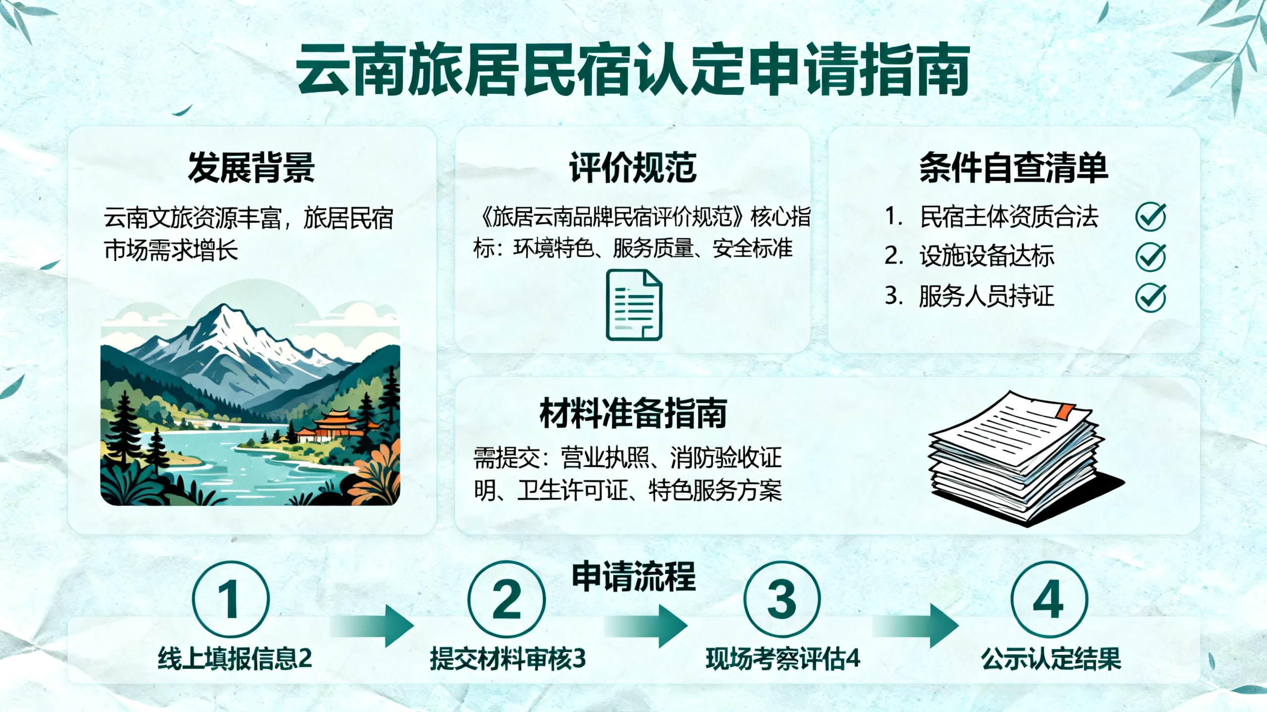 所有材料须真实准确,严禁弄虚作假;格式统一规范,电子版为PDF格式;建议提前1-2个月开始准备,可参考T/YNMS-001《旅居云南品牌民宿建设指南》完善硬件和服务体系。