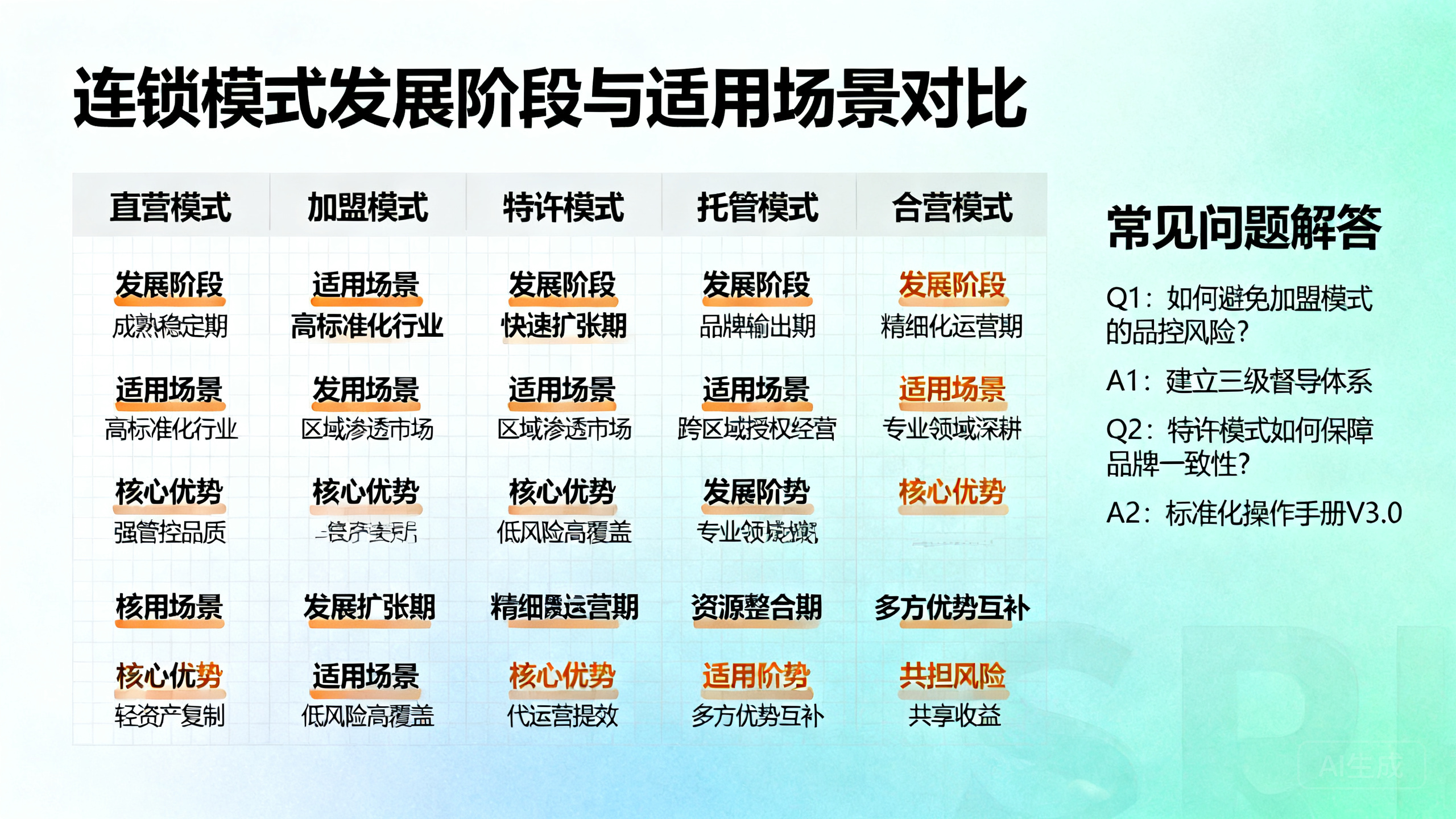 对比维度 直营模式 加盟模式 托管模式 联营模式 轻资产模式